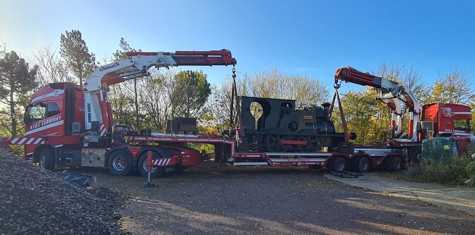 The team working together to do a tandem hiab lift of 28 ton steam train for another Suffolk customer.